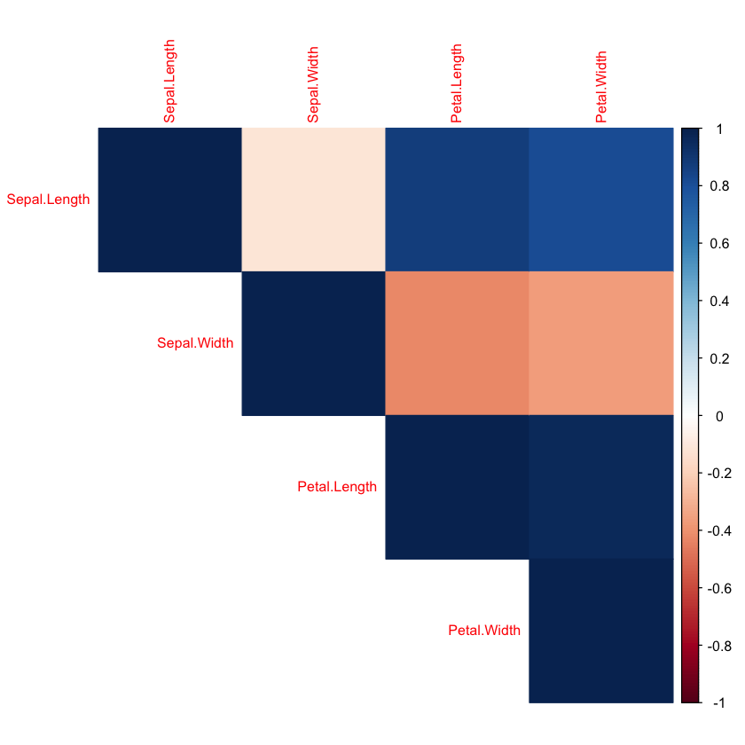 corrplot(cor(df[, 1:4]), method="color", type="upper", tl.cex=0.8)