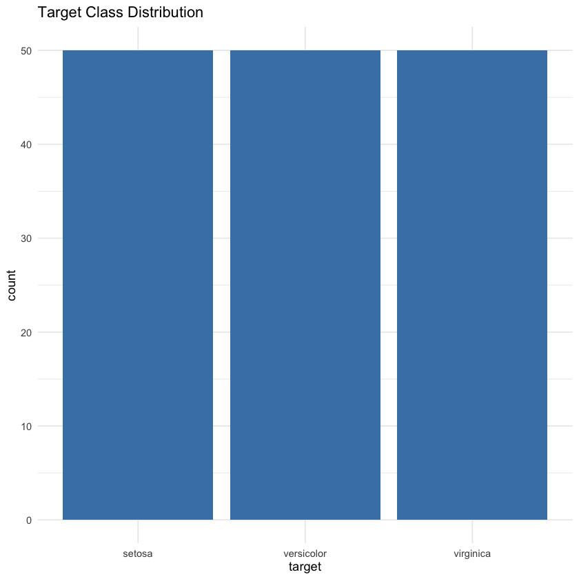 checks for any missing values in the dataset—although the Iris dataset is clean, it’s good practice to confirm this before proceeding. Next, a bar chart is created using ggplot()
