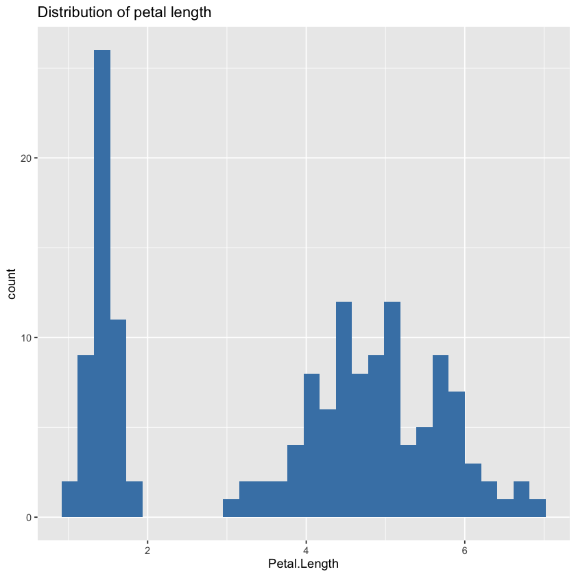 , a histogram is plotted to show how frequently each petal length value occurs: