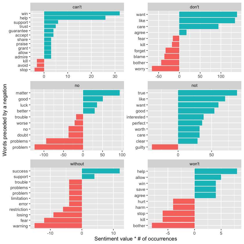 Next, we can define a list of six words likely to indicate negation—such as “no,” “not,” and “without”—and visualize the sentiment-related words that most frequently follow them. This highlights words that often contributed to sentiment in the “wrong” direction.