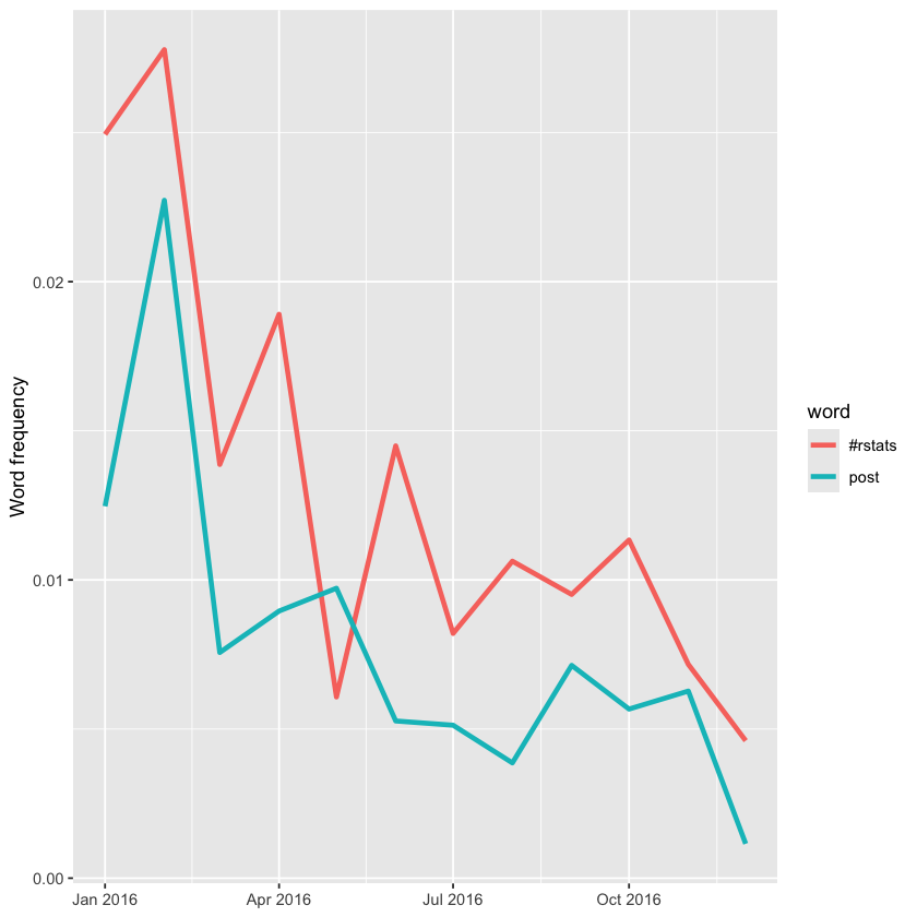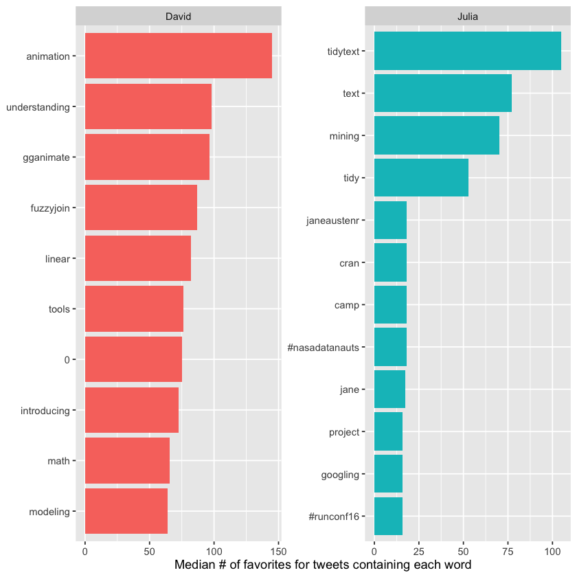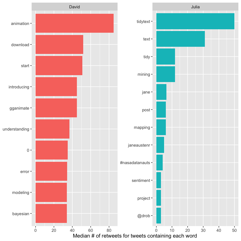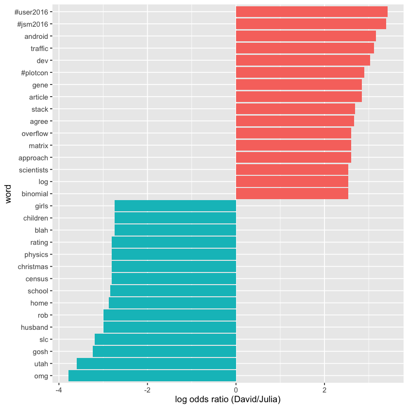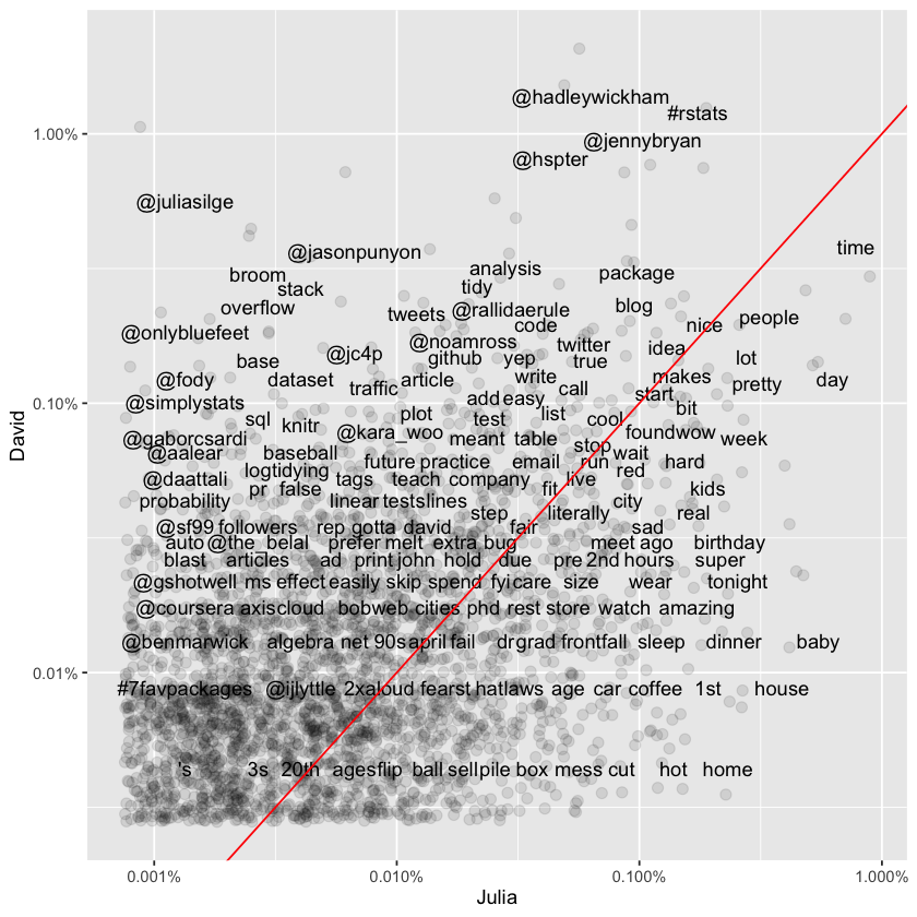 Online text, especially from platforms like Twitter, receives a lot of attention in text analysis. Many sentiment lexicons used in this book were specifically designed for or validated on tweets, reflecting the unique language and style found there. Both authors of this book are active Twitter users, so this case study explores a comparison between the entire Twitter archives of Julia and David.