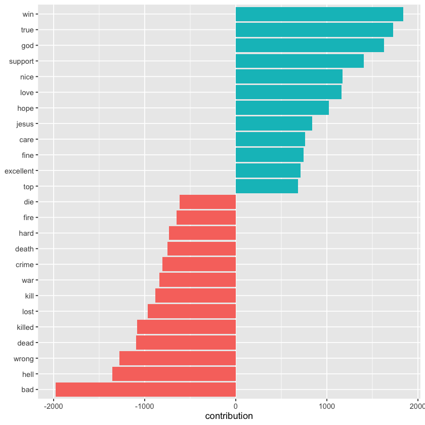 ggplot(aes(contribution, word2, fill = contribution > 0)) +