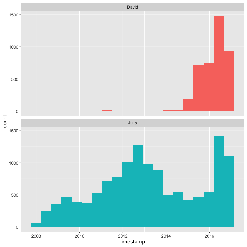 David and Julia currently tweet at roughly the same rate and joined Twitter about a year apart, but there was a period of about five years when David was inactive on the platform while Julia remained active. As a result, Julia has accumulated approximately four times as many tweets as David overall.